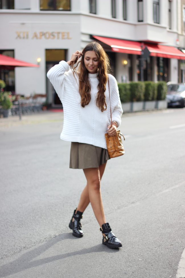 Die Kombination aus Skaterrock, Grobstrick-Pullover und derben Boots gehört zu meinen Lieblingslooks. Ich liebe es einfach Röcke mit derben Boots und Grobstrick zu kombinieren. Am Liebsten trage ich den Look ohne Strumpfhose, das wird bei den Temperaturen langsam aber kritisch. Aber auch mit Strumpfhose trage ich solche Outfits im Herbst und Winter noch super gerne. Nach dem Pullover haben mich einige schon auf Instagram gefragt, er ist von Vila und aus dem letzten Jahr. Ich habe ihn allerdings noch (reduziert) bei Asos gefunden (hier). Die Boots von River Island sind DIE perfekten Balenciaga Lookalikes und werden bei mir garantiert zum Evergreen (hier).