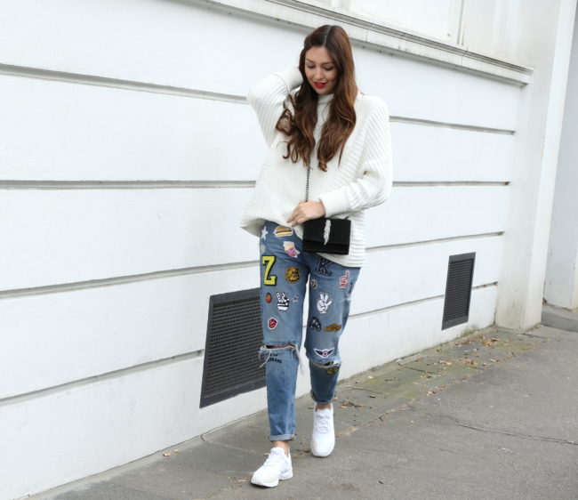 Patches – meine neue Lovestory. Es hat schleichend angefangen und nun bin ich besessen von ihnen. Patches auf Kleidung, Schuhen und Accessoires. Für mich eines DER großen Trends in 2016. Meine Sammlung vonn coolen Teilen mit Patches hat sich nun um ein absolutes Traumteil erweitert, denn diese Hose von Zoe Karssen über About You ist für Jeansliebhaber und Patches-Freaks natürlich der Knaller. Ich habe das gesamte Outfit bis auf die Tasche (Zara) bei About You geshoppt und ich habe mich lange nicht mehr so sehr über ein Paket gefreut wie über dieses. Neben der tollen Hose war nämlich noch der wunderschöne weiße Pullover dabei, den man auch im Frühling super tragen kann (ohne Jacke, juhu). Ein weiteres Highlight waren meine neuen und tatsächlich ersten Sneaker von Adidas. Ich habe sie bei der lieben Verena von Who is Mocca gesehen und musste sie sofort haben. Zu weißen Sneakers muss ich nicht mehr viel sagen, aber dieses Modell hat es mir besonders angetan und sie sind auch wirklich bequem. Ich hoffe euch gefällt das Outfit genauso gut wie mir, denn die einzelnen Teile werdet ihr hier definitiv noch öfter sehen. Achja, falls ihr die Hose bestellen wollt, unbedint 1-2 Nummern kleiner bestellen! Habt einen schönen Sonntag! x. Kira