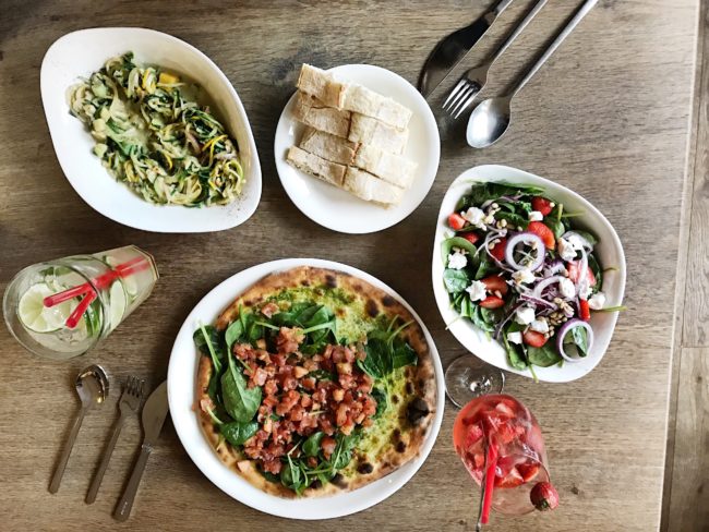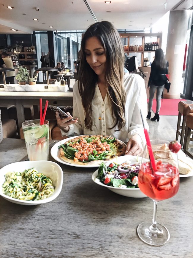 Noch kurz zu meinem Abend gestern, ich esse meistens den großen gemischten Salat mit Rucola Senf Dressing (BESTES!!! DRESSING  überhaupt), die Pesto con Spinaci Pizza oder Dinkel-Fussilli mit Pesto, aber gestern haben wir mal ein paar neue Gerichte bestellt und waren sehr happy damit. Es gibt momentan als Special Zoodles ( Nudeln aus Zuccini, also ohne Kohlenhydrate) mit Thai-Gemüse und Kokosmilch und das war sooo unglaublich lecker und mir haben normale Nudeln NULL gefehlt. Außerdem hatten wir den Spinat-Salat mit Erdbeeren, Ziegenkäse und Himbeere-Vinaigrette und der war auch super lecker. Werde ich beides definitiv nochmal bestellen. Und die Sommerdrinks die es gerade gibt kann ich auch total empfehlen, ich habe  die Ingwer-Limetten Limo getrunken, die war sooo gut und am Schluss hatten wir noch Erdbeere-Rhabarbar und Erdbeer-Basilikum Spritz. Die waren auch sehr lecker und erfrischend und die perfekten Mädels-Drinks.