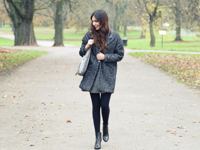 Da die Stiefel trotz stylischen Reißverschluss Details sehr klassisch aussehen, wollte ich ein schlichtes Outfit dazu kombinieren, die Stiefeletten sollen ja im Fokus stehen! Da ich aber eigentlich kein Mensch für diese ganz klassischen Outfits bin, habe ich einen graumelierten Wollmantel ausgewählt, der zwar auf den ersten Blick schlicht aussieht, durch den Oversize-Schnitt und den Leder-Kragen aber etwas an Coolness gewinnt. Unter dem Mantel trage ich ein ganz schlichtes graues Baumwollkleid und Strumpfhosen. Die hellgraue Stella Dupe Tasche fand ich zu dieser Kombination perfekt.